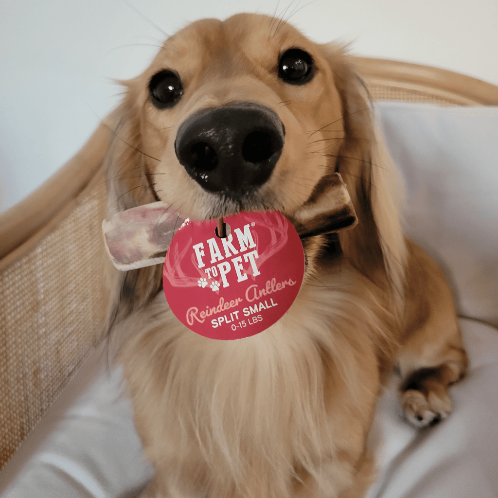 Farm to Pet antler chews are healthy and safe chews for dogs. Unlike bones, our organic antler sheds for dogs are naturally splinter-resistant, long-lasting and durable, able to withstand even aggressive chewing by powerful canine jaws. Keep in mind that dogs should not be given any dog chews including antler dog chews if they have weak, loose or broken teeth or to puppies who still have their milk teeth. Dogs should be supervised any time they are enjoying chew time with their favorite chew toy, including antler dog chews.